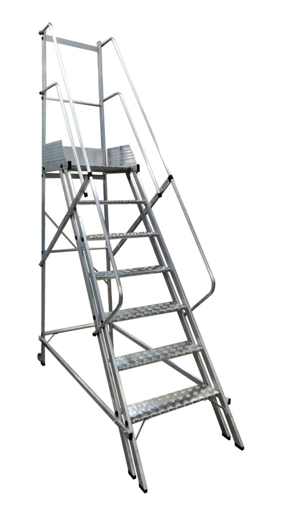 Possui corrimão em ambos os lados. Guarda-corpo na plataforma superior com 110 cm de altura. A plataforma de trabalho é fabricada em placa xadrez de alumínio com frisos antiderrapantes, com dimensão de 60 x 50 cm. Os degraus têm 17 cm de profundidade também fabricados em chapa xadrez de alumínio. São equipadas com 2 rodas na estrutura oposta à que sustenta os degraus para permitir fácil movimentação da escada.
